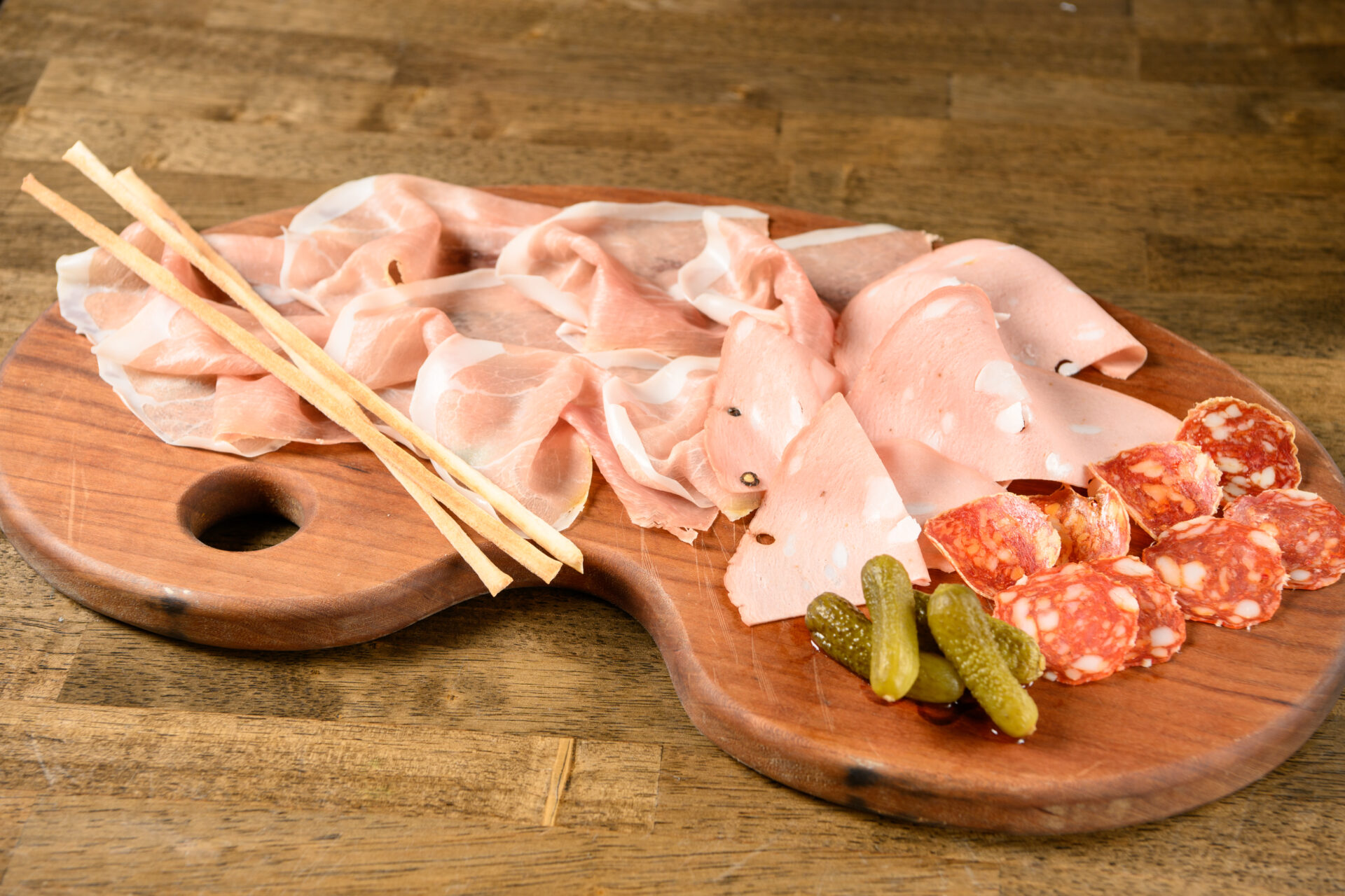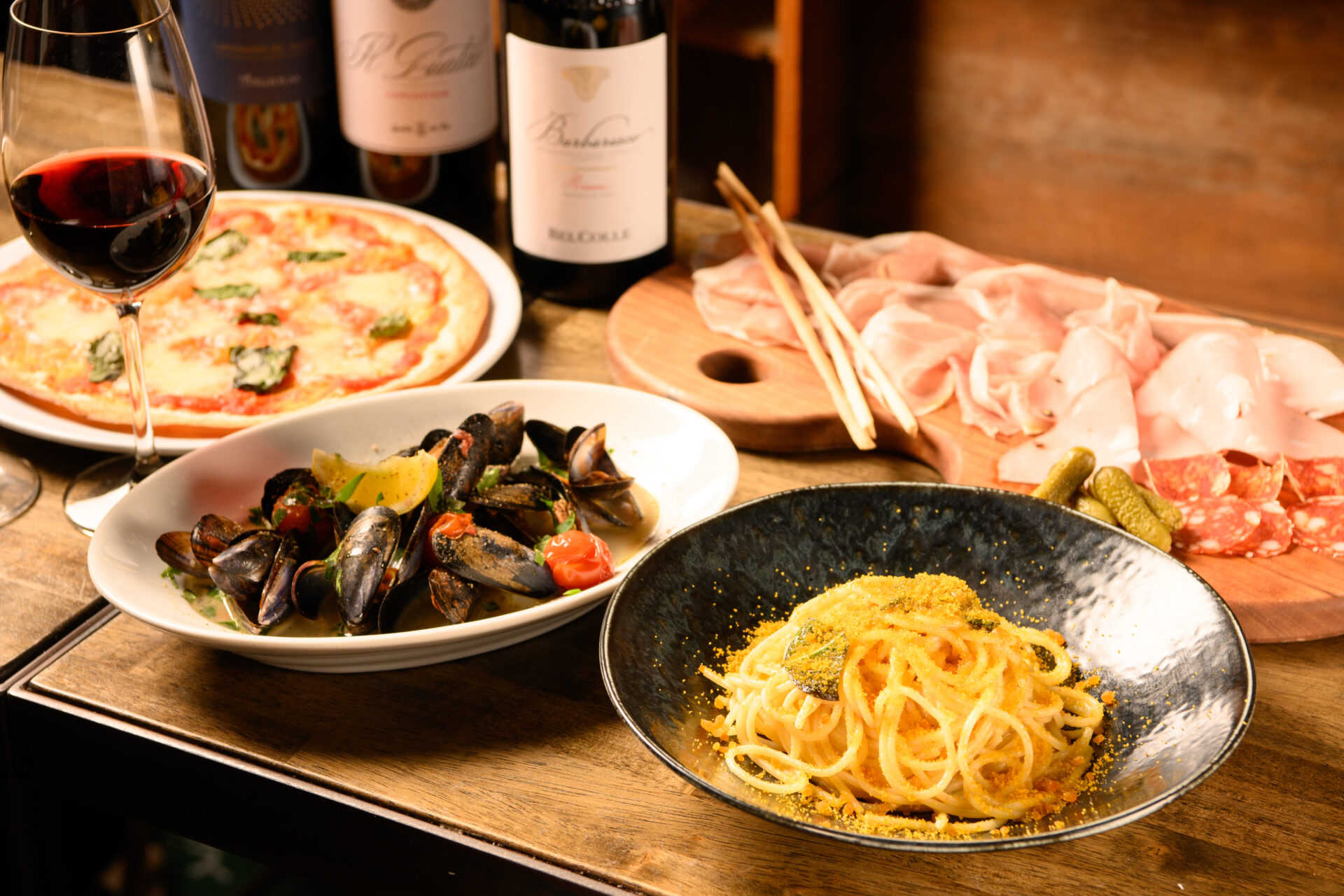 注文を受けてからスライスする生ハムやイタリア産チーズなどの軽いおつまみから、パスタやステーキなどのしっかりしたお食事まで、幅広くそろえております。